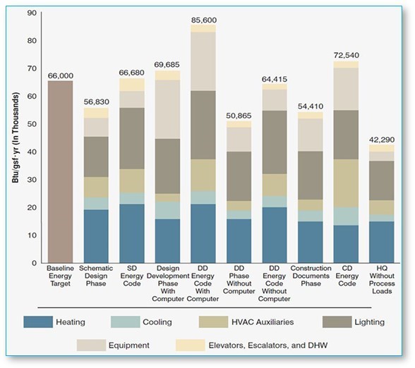 See the images below showing projected performance for a corporate headquarters in Cleveland OH. The design team made massing adjustments from Schematic Design to Design Development and then again at Construction Development in order to keep their energy performance goals within .